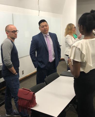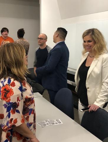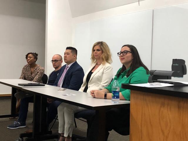 Five alumni presented as part of a panel at the last NCA Future Pros meeting of the academic year. The panel was entitled "I didn't know you could do with a COMM degree." Featured panelists were (from left to right) Brittani Youman (B.A., 2010; Product Marketing Manager at Lennox International), Alex Christensen (B.A., 2012; Atlassian Suite Engineer at AppDynamics), Bryan Lysinger (B.A., 2012, M.A., 2015; Financial Advisor), Shae Nault (B.A., 2004; Real Estate entrepreneur), and Natalie Roffino (B.A., 2005; Unemployment Claims Specialist at Southwest Airlines).