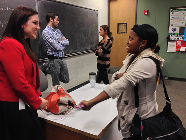 Communication Studies alums Kelly Snyder (M.S., 2009) and Cody Spain (B.A., 2008) were guest speakers at the recent NCA Future Pros meeting. Kelly is currently a Talent Acquisition Manager at JC Penney's, while Cody is a Multimedia Specialist at Blue Cross and Blue Shield of Illinois, New Mexico, Oklahoma, and Texas. Both speakers discussed their career paths, how to network, the values of internships, and how they use their Communication Studies degree in their current positions.