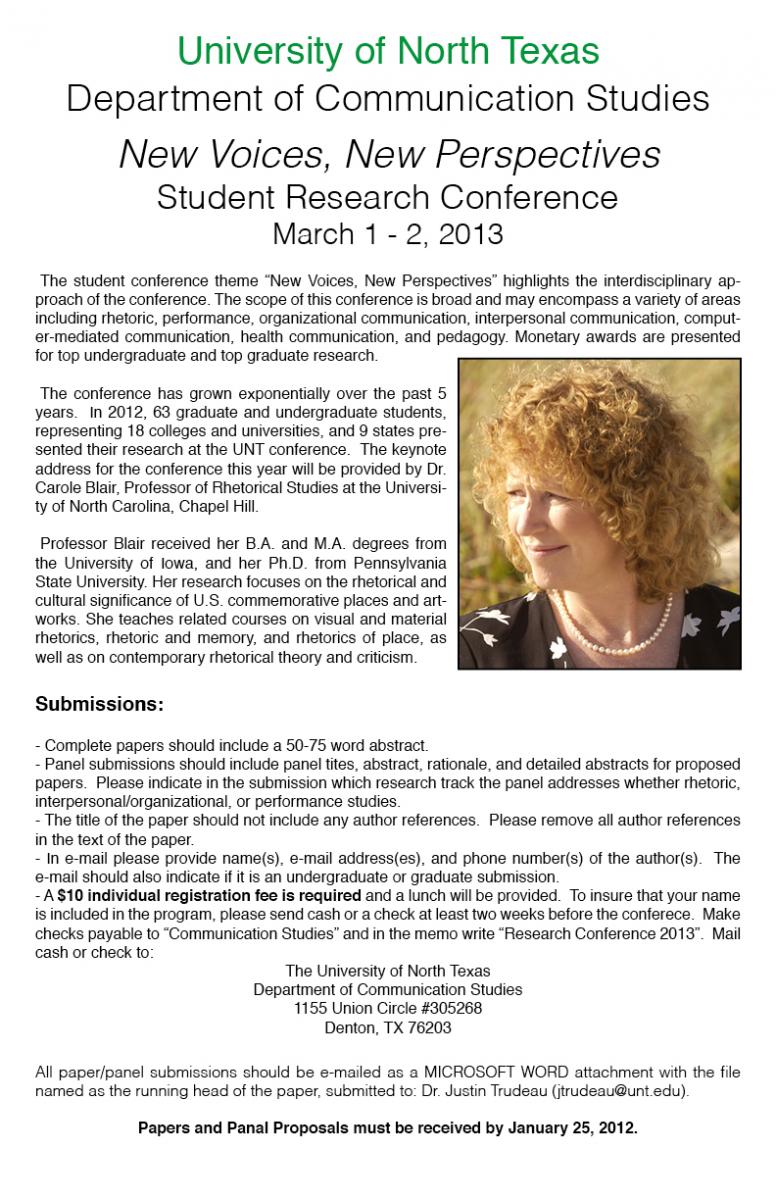 The call is out for papers and panels for the "New Voices, New Perspectives" student research conference! Get your submissions in by January 25, 2013 to Dr. Justin Trudeau (jtrudeau@unt.edu) and send in your $10 registration fee (to cover food) by February 15, 2013.