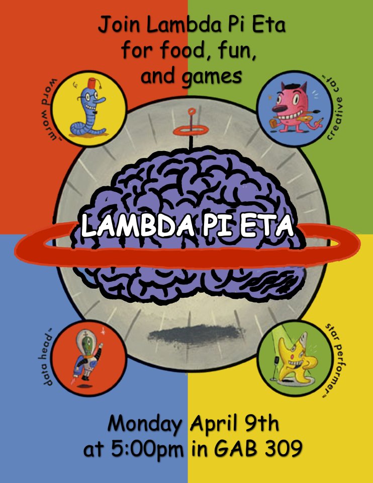 Lambda Pi Eta will be hosting a Game Night on Monday, April 9, at 5PM in GAB 309. Take a short break from your studies and join us for board games, food, and COMM friends!