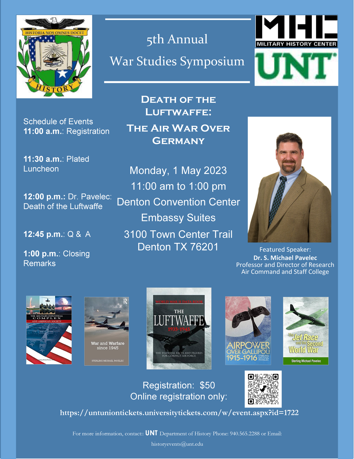 The 5th War Studies Symposium was held on Monday, 1 May 2023 at the Embassy Suites in Denton. The theme of the Symposium was: "Death of the Luftwaffe: The Air War over Germany" was presented by Dr. s. Michael Pavelec, Professor and Director of Research, US Air Command and Staff College.