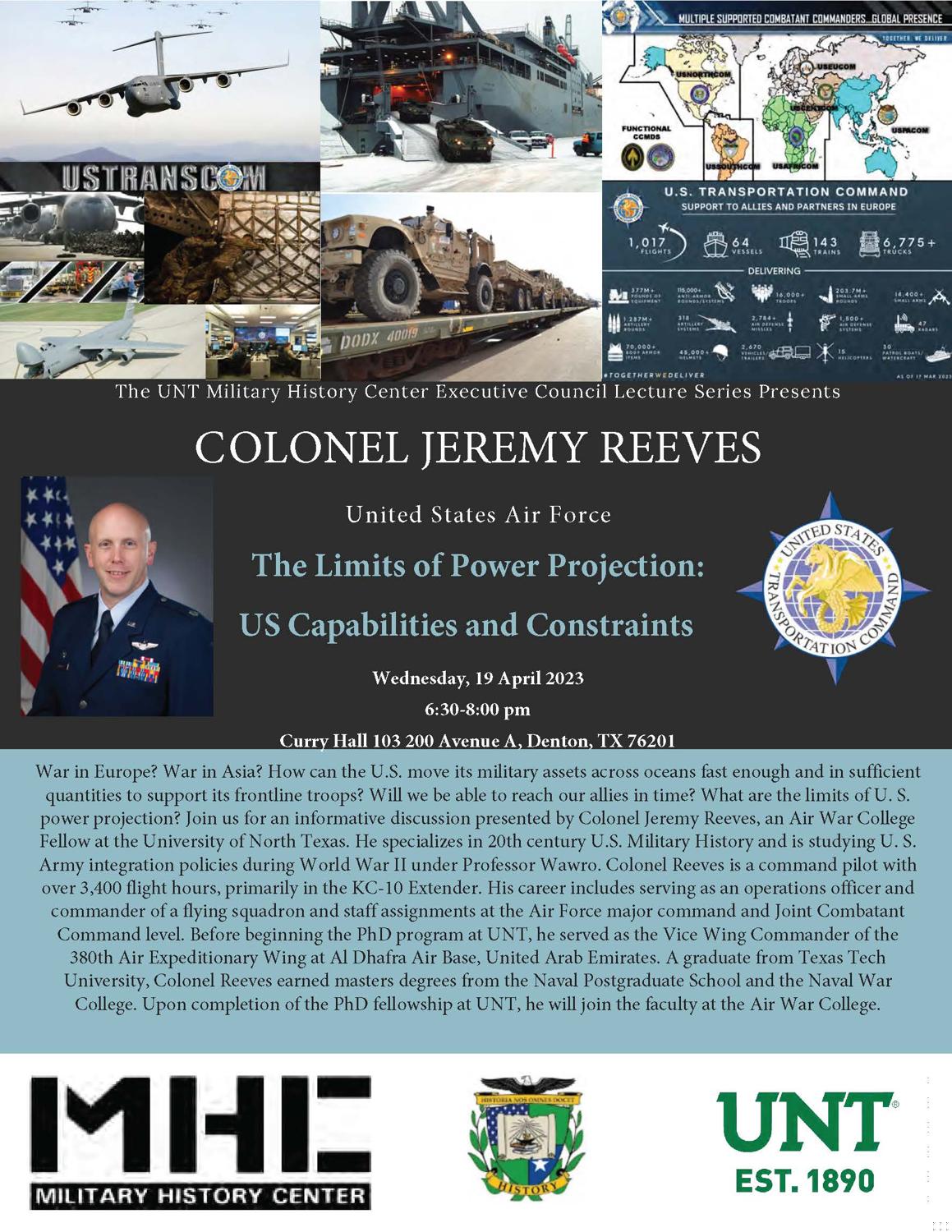 Colonel Jeremy Reeves, United States Air Force and UNT PhD candidate, gave the Spring 2023 Executive Council Lecture, "The Limits of Power Projection: US Capabilities and Constraints" on 19 April 2023.