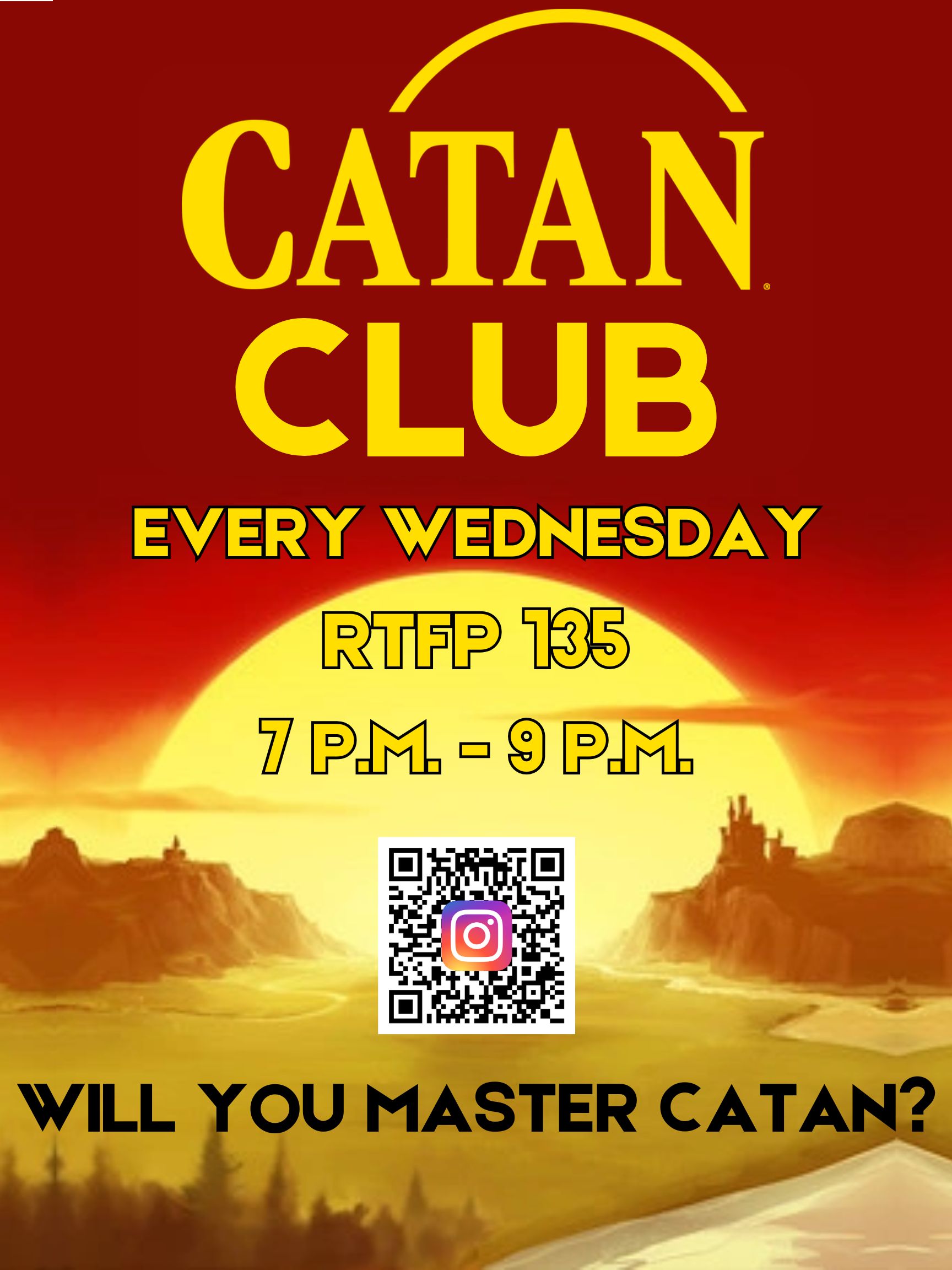 At Catan Club, you will be placed into a game with other Catan Club Members to play. We foster camaraderie and sportsmanship and welcome all. We provide Catan sets at the meetings for you to play, if you have your own set, feel free to bring it for the club. Meetings are Wednesdays, 7-9 PM in RTFP 135. (Flyer)