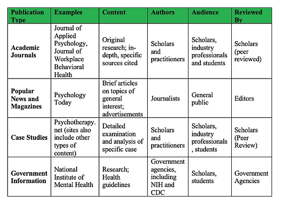 There are many sources you will encounter as you research in psychology. These sources have different characteristics. Take care to match the sources you use to your projects.